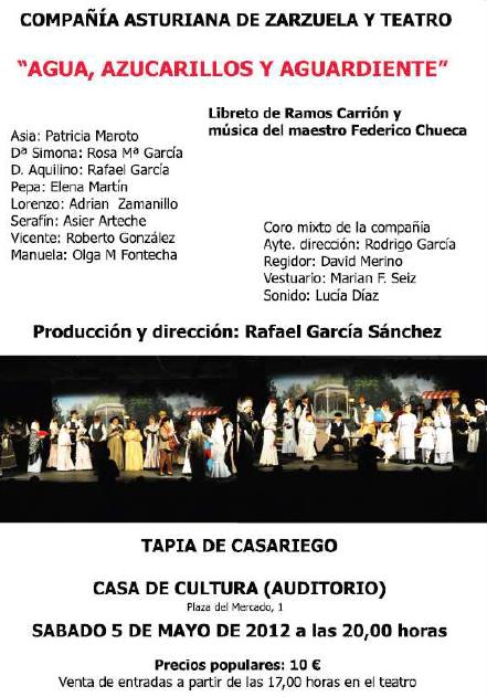 La Compañía Asturiana de Zarzuela y Teatro representará la popular y castiza zarzuela “Agua, Azucarillos y Aguardiente” el sábado 5 de mayo, a las 20:00 horas en el Auditorio de la Casa de Cultura de Tapia de Casariego.