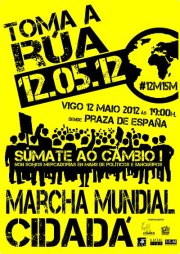 RECORRIDO PROPUESTO: PLAZA DE ESPAÑA- GRAN VÍA- COLÓN- PLAZA DE «A ESTRELA» POR QUE NO SOMOS MERCANCÍA EN MANOS DE POLÍTICOS Y BANQUEROS!!! Somos el 99%. #12m15m … La distribución actual de los recursos económicos condena a la inmensa mayoría de la población mundial a la pobreza o a la incertidumbre diaria, y a las generaciones del futuro a una herencia marcada por los riesgos medioambientales. Todo para el beneficio de unos pocos. Reclamamos justicia social, no daremos un paso atrás en la defensa de nuestros derechos. Nuestros representantes tienen la obligación de hacer valer nuestras necesidades, deben escucharnos. Como hicimos el 15 de octubre del año pasado, convirtamos las calles en el mayor altavoz del mundo el 12 de mayo. Porque somos el 99%. Porque no somos mercancía en manos de políticos y banqueros. Tomemos las calles el 12 de mayo. Exigimos una Democracia real ¡YA! ► Síguenos en Twitter: @12m_15m | @DRYnternational