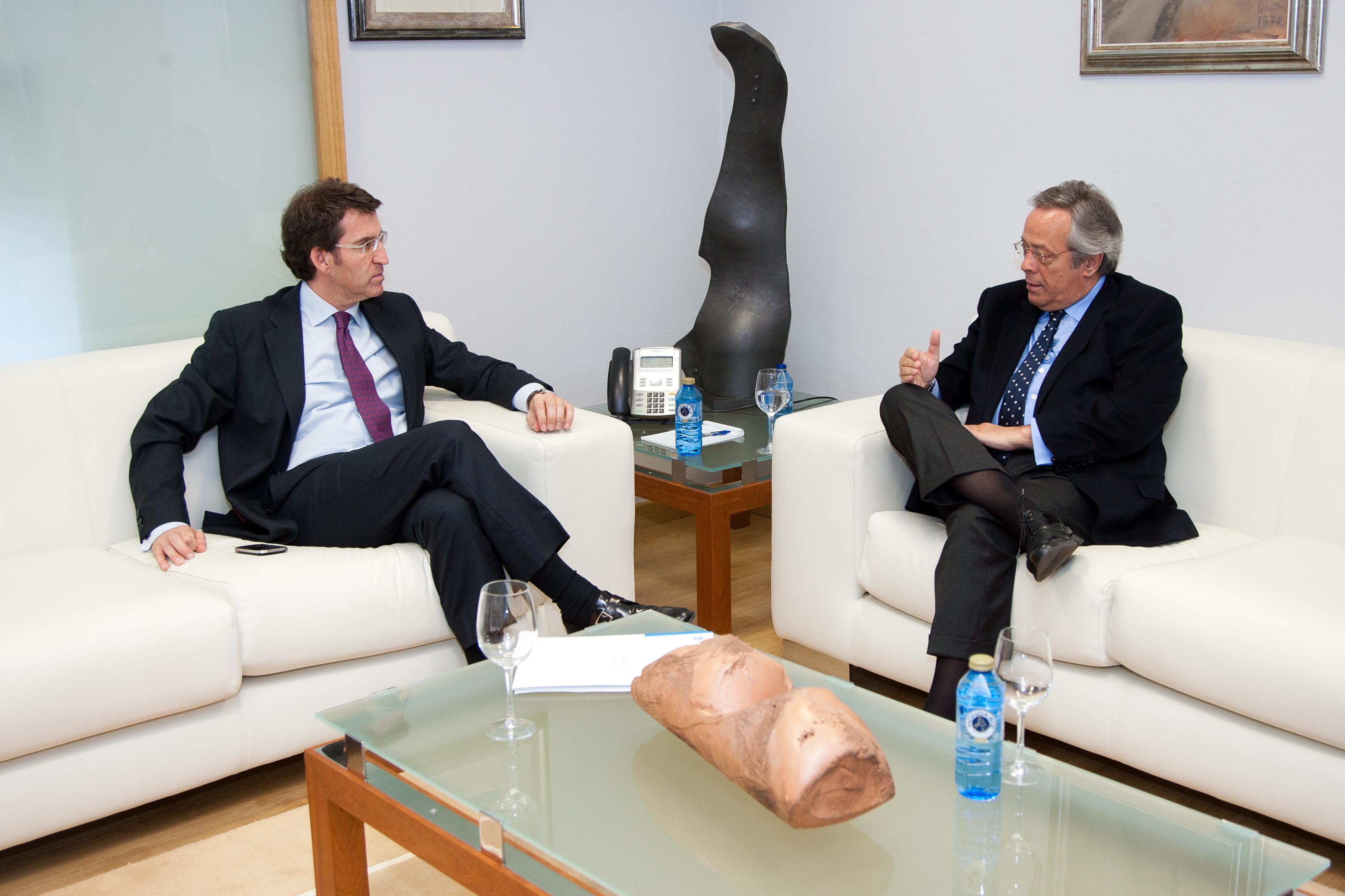 Santiago, 22 de mayo de 2012.- El presidente del Gobierno gallego, Alberto Núñez Feijóo, mantuvo hoy un encuentro con el presidente de la SEPI, Ramón Aguirre, en el que ambos abordaron la situación actual de los astilleros públicos de la ría de Ferrol. En la reunión, el jefe del Ejecutivo autonómico le trasladó al presidente de la SEPI a preocupación del Gobierno gallego por la situación de incertidumbre que vive la industria naval de Ferrol a causa de la falta de carga de trabajo en sus diques.