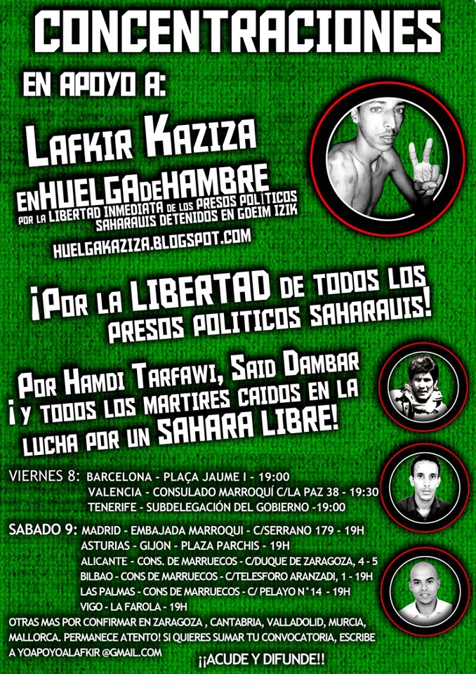 Por la libertad de los presos saharauis y en apoyo al joven saharaui Lafkir Kaziza, que desde el pasado 1 de junio permanece en huelga de hambre indefinida en las inmediaciones de la embajada de Marruecos en Madrid, con el fin de exigir un juicio justo o la liberación inmediata de los presos saharauis encarcelados tras el brutal desmantelamiento del Campamento de Gdeim Izik en diciembre de 2010.