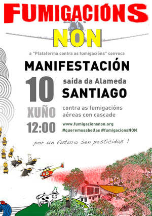 10 de xuño de 2012 – Manifestación Nacional contra as fumigacións tóxicas en Compostela às 12h (Alameda). // A protesta social contra o plan de fumigacións aéreas masivas do pesticida flufenoxurón (Cascade) preparada por ASPAPEL ten que obrigar á Xunta de Galicia a retirar a autorización. Para iso necesitamos berrar nas rúas de Compostela como berramos no Twitter, no Facebook, en Change.org. Mobilízate nesta guerra contra o invasor que quere acabar co noso agro! http://fumigacionsnon.org