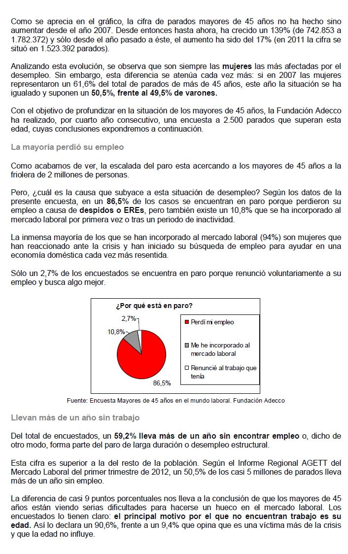 - En lo que llevamos de 2012 se han realizado 1.043.158 de contratos laborales a mayores de 45 años, pero sólo un 5,2% ha logrado un contrato indefinido.