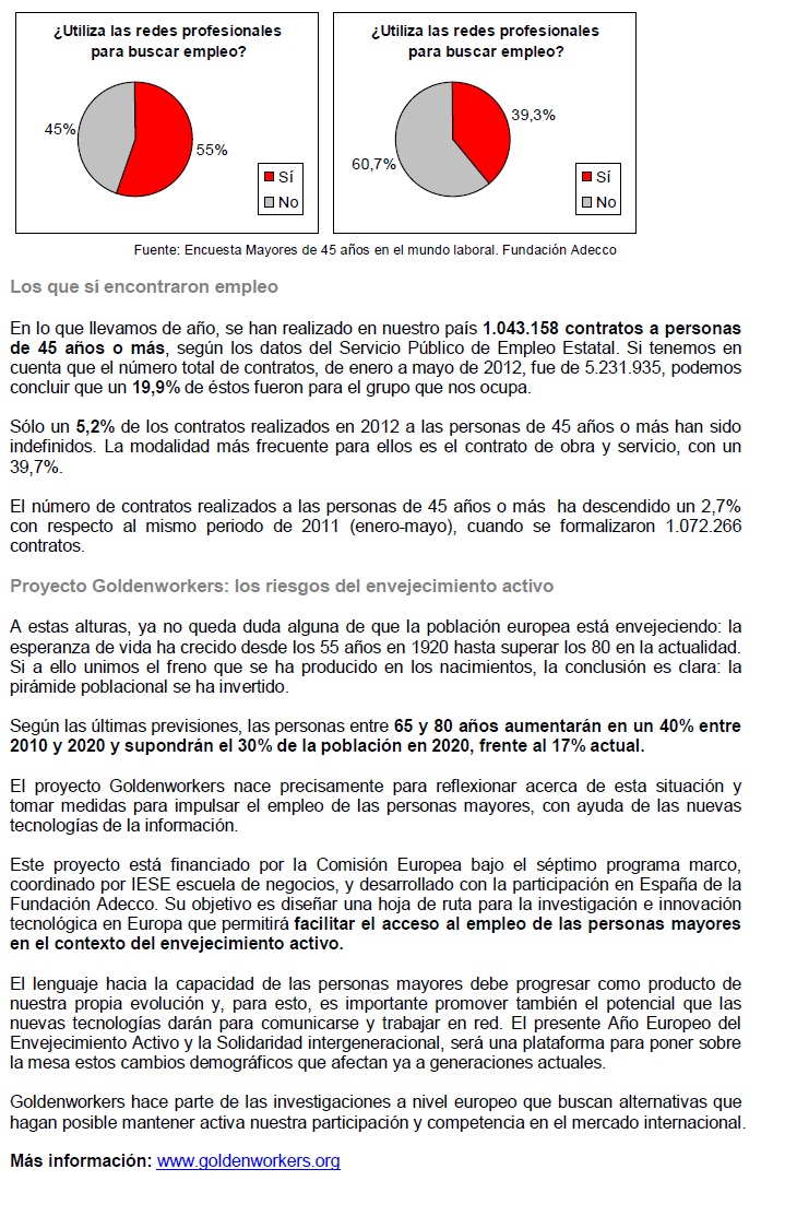 - 2012 es el año europeo del envejecimiento activo: según recientes previsiones, la población entre 65 y 80 años crecerá en un 40% entre 2010 y 2020. El proyecto Goldenworkers, impulsado por la Fundación Adecco –entre otros- identifica los riesgos de este envejecimiento y propone soluciones.