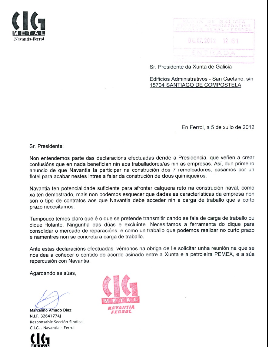 Ante as continuas informacións que se están a difundir dende a Presidencia da Xunta de Galicia en relación ao Acordo entre a petroleira PEMEX e a Xunta, dende a sección sindical de Navantia-Ferrol queremos manifestar que no día de hoxe solicitamos unha reunión co Sr. Presidente a fin de aclarar as manifestacións citadas.