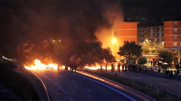 Todo empezó cuando un grupo relacionado con el conflicto minero colocó cuatro barricadas en la zona, dos para cortar la autopista A-66 en dirección Asturias-León, y otras dos en el medi de la localidad.