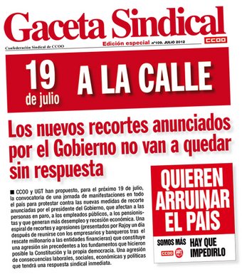 Los tres sindicatos mayoritarios en Galicia —CC.OO., UGT y CIG— llaman a la movilización general de todos los sectores este jueves 19 de julio de 2012 en las principales ciudades en contra de los recortes. El lema compartido será: «No al saqueo del pueblo, hay que impedir que nos arruinen».