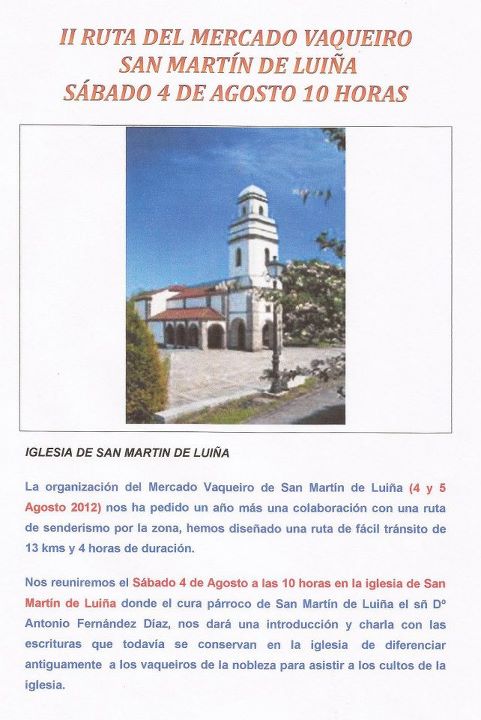 Nos reuniremos el Sábado 4 de Agosto a las 10 horas en la iglesia de San Martínde Luiña donde el cura párroco de San Martín de Luiña el sñ Dº Antonio Fernandez Diaz, nos dará una introducción y charla con las escrituras que todavia se conservan en la iglesia de diferenciar antiguamente a los vaqueiros de la nobleza para asistir a los cultos de la iglesia.