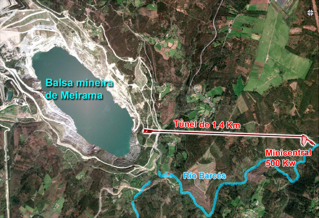 Esta é a verdadeira razón de ser deste delirante proxecto: producir quilovatios camuflando o proxecto como unha infraestrutura de subministro. Se o que se quere é usar a auga da balsa mineira como reservorio e desaugala polo río Barcés, como é que non se conecta directamente ao río, situado a poucos metros do mal chamado «lago» de Meirama? A opción de construir un túnel de 1,4 kilómetros e 3,5m de diámetro resulta técnicamente máis complicada e moito máis cara que facer un desaugue directo. No entanto, se o que pretende é turbinar a auga, non se pode facer a pé de encoro: Precísase unha significativa diferenza de cotas entre a captación (balsa) e o punto de entrega (central hidroeléctrica). Eis a razón do túnel, que actúa como tubaría de presión para a minicentral.