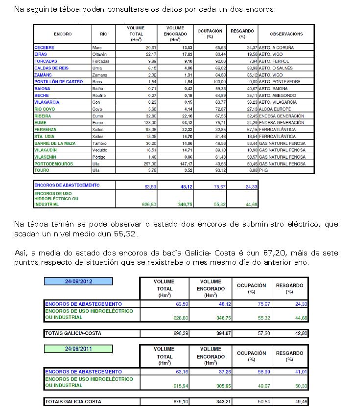 Santiago, 26 de septiembre de 2012.- El estado de los embalses de abastecimiento de la cuenca Galicia- Costa se encuentran al 75% de su ocupación (75,67), lo que se traduce en casi 20 puntos más respeto a la situación que se registraba el pasado año por estas mismas fechas. Así, se desprende del informe de Augas de Galicia del 24 de septiembre, que se puede consultar en la página web de este organismo dependiente de la Consellería de Medio Ambiente, Territorio e Infraestructuras.