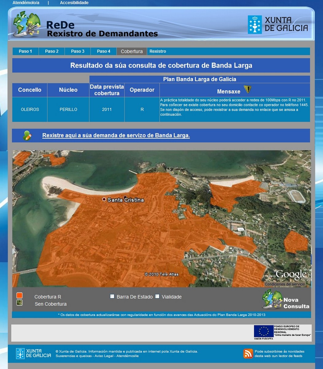 Santiago, 2 de diciembre de 2012.- El Registro de Demandantes Red permitió atender un total de 765 solicitudes de cobertura de Internet del Plan de Banda Ancha de la Xunta. Esta aplicación informática fue puesta en marcha en enero de 2011 por la Agencia para la Modernización Tecnológica de Galicia (Amtega) para que los ciudadanos habían podido consultar la situación del Plan de Banda Ancha en su núcleo de población y registrar su demanda de servicio en caso de carecer de cobertura.
