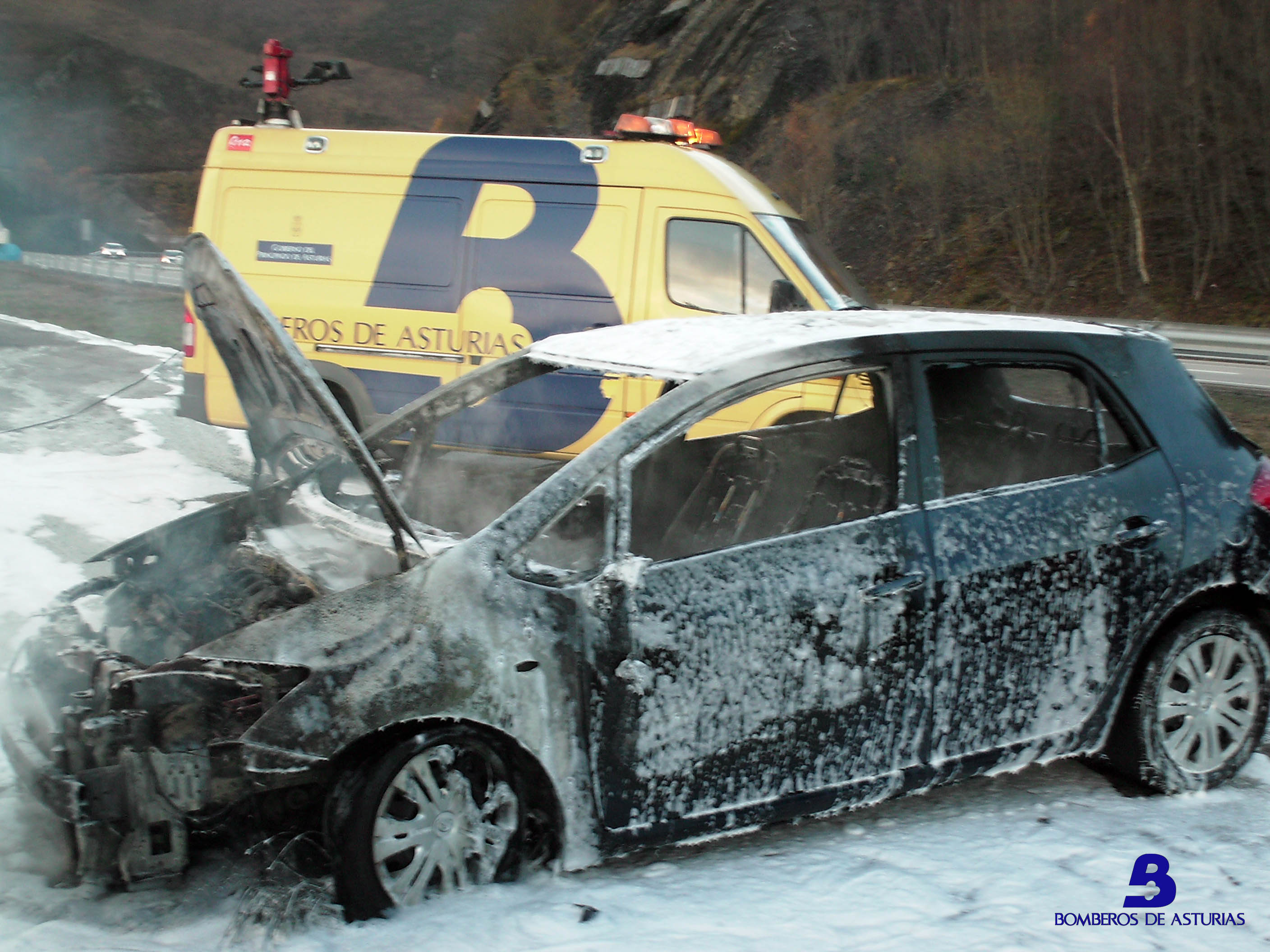 Efectivos de Bomberos de Asturias con base en el parque de Mieres han extinguido un incendio declarado en un vehículo que circulaba por la autopista AP-66, a la altura del punto kilométrico 76, en sentido León.