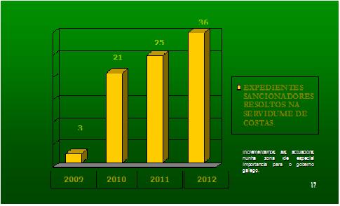 La protección del Litoral Otro aspecto destacable es la preocupación por proteger la costa de Galicia, ya que el litoral es uno de los valores de identidad de nuestra comunidad. La actividad de inspección de la APLU se está incrementando considerablemente en esta zona, ya que si en el año 2009 se iniciaron 9 expedientes, en el 2010 fueron 43, y en los años 2011 y 2012 fueron 50 expedientes cada año.