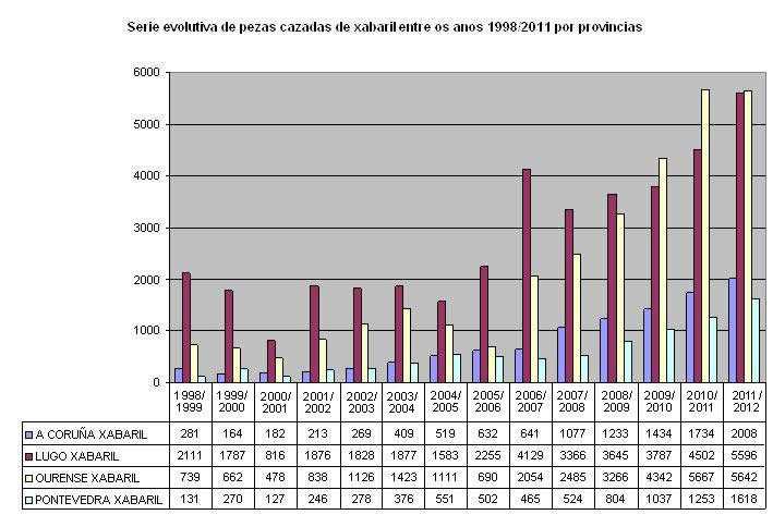 No seguinte gráfico apréciase a serie evolutiva de pezas cazadas de xabaril entre os anos 1998 e 2012 por provincias.