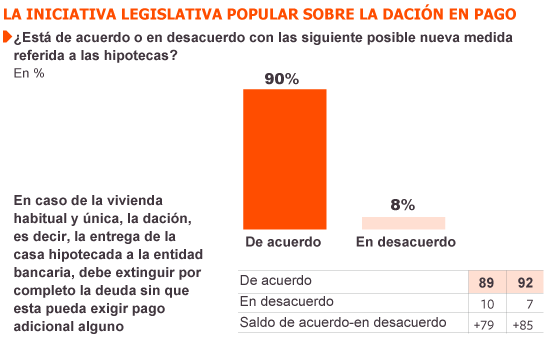 La abrumadora mayoría de los españoles (87%) considera que el Congreso de los Diputados ha hecho lo correcto dando audiencia a la Plataforma de Afectados por la Hipoteca (PAH) y admitiendo a trámite la iniciativa legislativa popular (ILP) sobre dación en pago propuesta por la Plataforma y avalada con su firma por casi un millón y medio de ciudadanos. Una opinión que es compartida por nueve de cada diez votantes del PP (87%), esto es, con su marcha atrás —el PP se negaba inicialmente a tramitar esta ILP—, los populares han votado en consonancia con la opinión mayoritaria entre su electorado.
