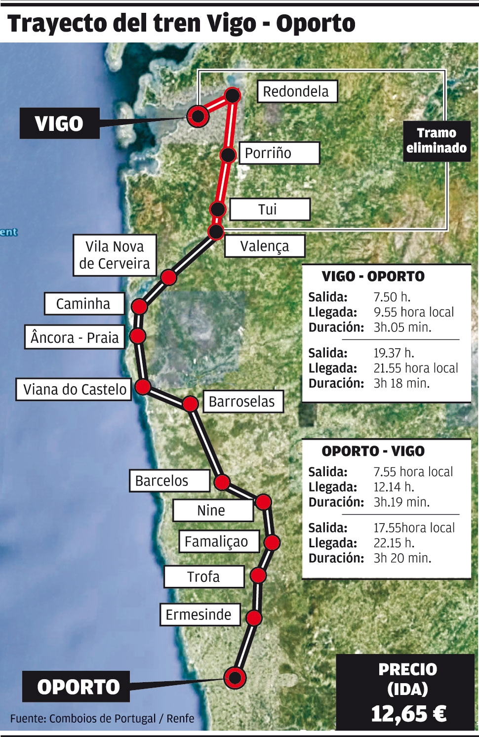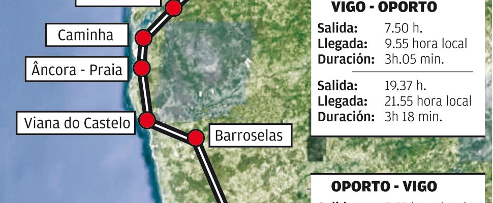 El primer tren directo que conectará Vigo y Oporto comienza a funcionar este lunes, por lo que la duración del viaje entre las dos ciudades pasará de tener una duración de 3.15 horas a poco más de dos horas.