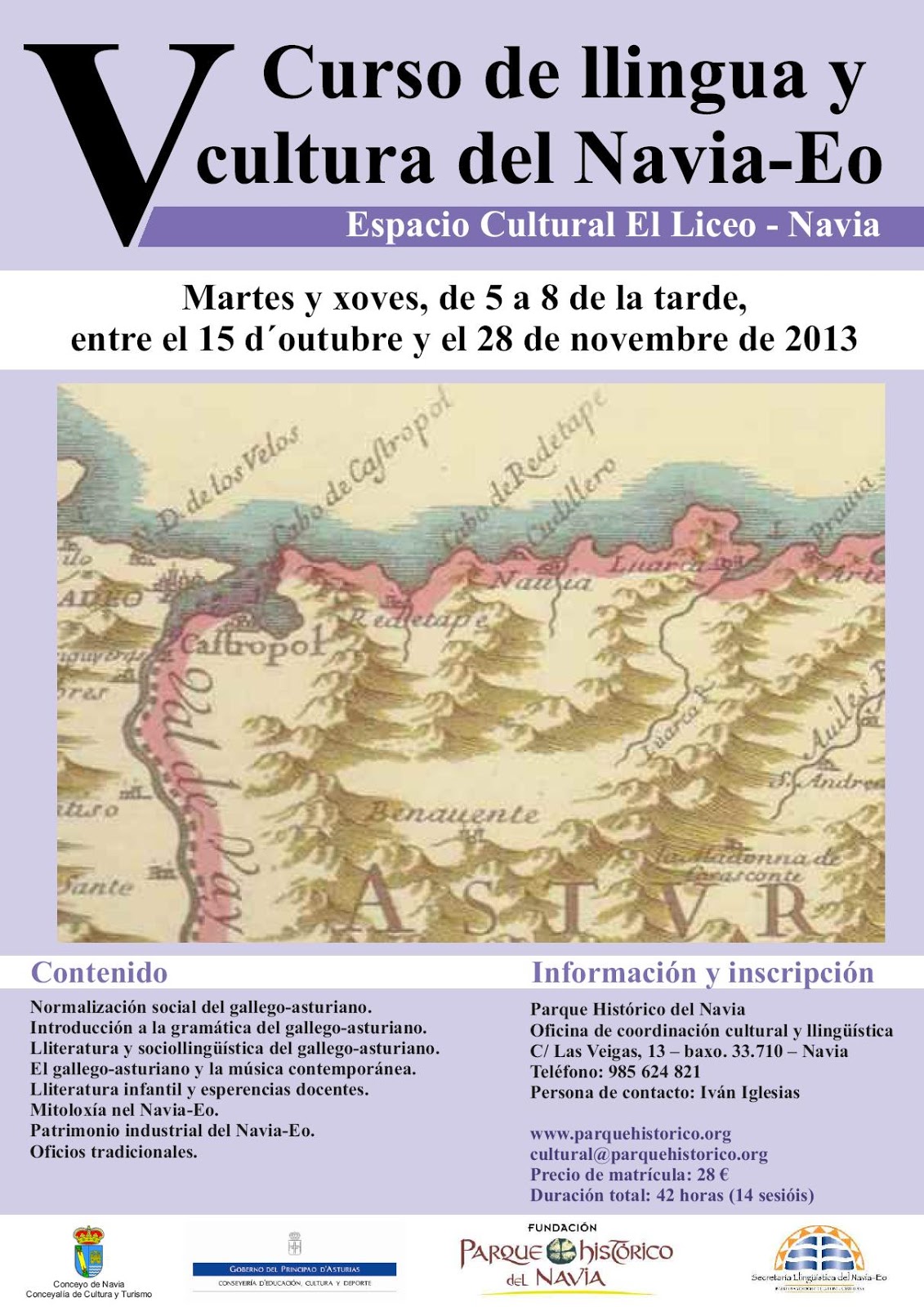 V Curso de llingua y cultura del Navia-Eo, a celebrar en la sala cultural El Liceo (Navia), entre el 15 de octubre y el 28 de noviembre de 2013. Matrícula abierta hasta el 30 de septiembre.