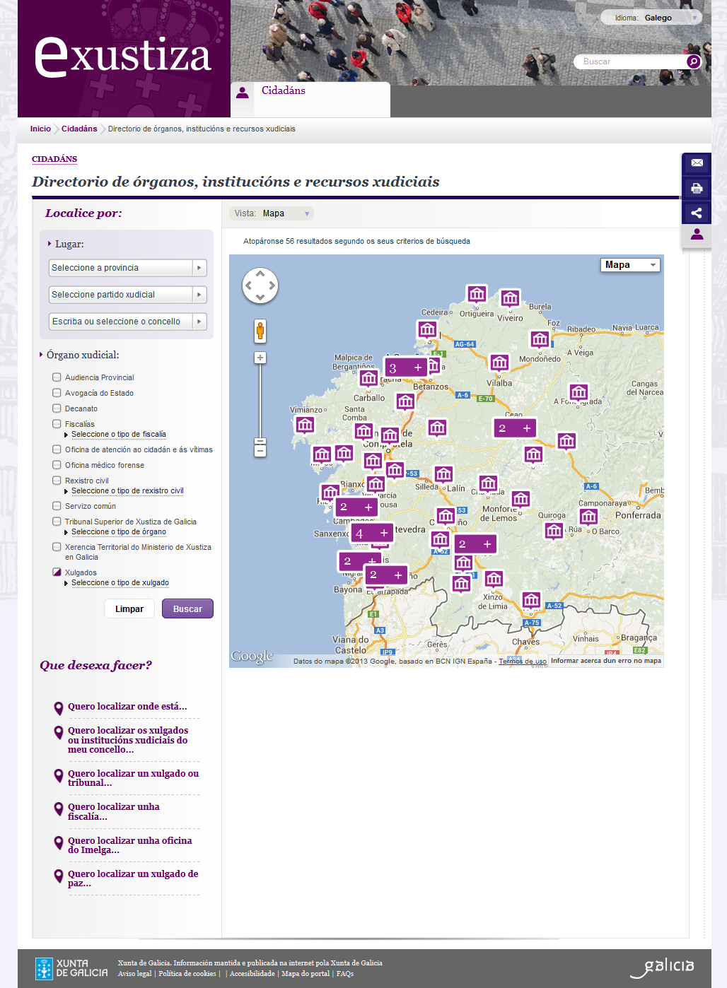 Directorio de órganos judiciales y formularios eXustiza incorpora un completo directorio de órganos judiciales, en el que se pueden encontrar 323 edificios y 696 órganos judiciales en Galicia: juzgados, registros civiles, fiscalías, oficinas de atención al ciudadano y las víctimas y otros órganos y servicios localizados en el mapa y con todos los datos de contacto.