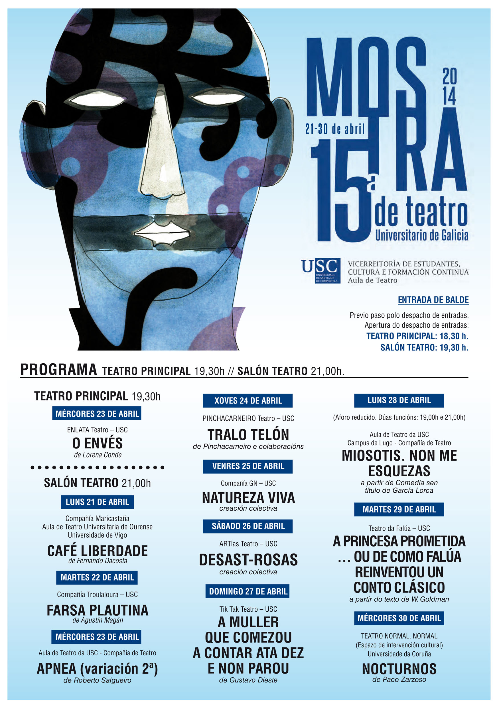 El espacio compostelano acogerá un total de 10 de los 11 espectáculos incluidos en esta nueva entrega de la muestra, que acerca al público los trabajos escénicos preparados durante este curso académico por las diferentes compañías de la USC, además de las convidadas de las universidades de Vigo y de A Coruña. Por su parte, el Teatro Principal ofrecerá el montaje restante el miércoles 23.