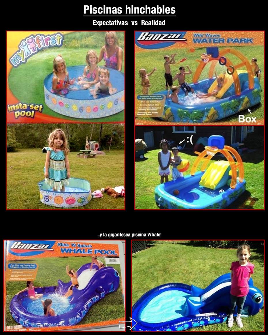 Increíble cómo se puede engañar al consumidor con una foto en la caja de un producto. Imaginad la cara del pobre niño cuando recibe su piscina y comprueba lo minúscula que es. Yo al fabricante le metía un puro que se le pasaban las ganas de jugar con el Photoshop.