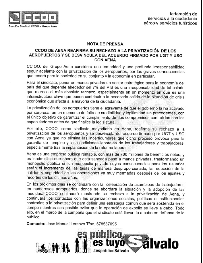 CCOO de Aena reafirma su rechazo a la privatización de los aeropuertos y se desvincula del acuerdo firmado por UGT y USO con Aena