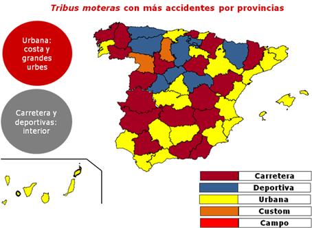 La Fundación Línea Directa ha querido conocer a través de este estudio cuál es la tribu motera con mayor accidentalidad en cada una de las 50 provincias que componen España. A nivel nacional, en grandes ciudades como Madrid o Barcelona y en muchas de las zonas costeras la Scooter es la moto con peor comportamiento siniestral, mientras que las motos Deportivas y de Carretera son las que mayor accidentalidad presentanen las provincias de interior.