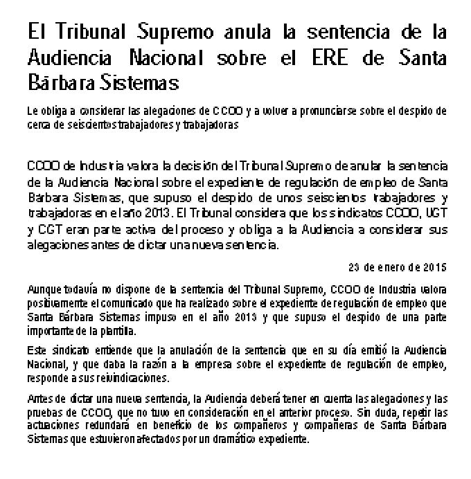 CCOO de Industria valora la decisión del Tribunal Supremo de anular la sentencia de la Audiencia Nacional sobre el expediente de regulación de empleo de Santa Bárbara Sistemas, que supuso el despido de unos seiscientos trabajadores y trabajadoras en el año 2013. El Tribunal considera que los sindicatos CCOO, UGT y CGT eran parte activa del proceso y obliga a la Audiencia a considerar sus alegaciones antes de dictar una nueva sentencia.
