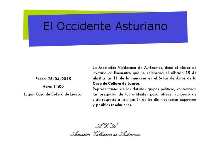 El próximo sábado 25 de abril de 2015 se celebra un Encuentro sobre «el Occidente Asturiano» en la Casa de Cultura de Luarca, organizado por la Asociación Valdesana de Autónomos. Políticos de las distintas agrupaciones contestarán las dudas de los asistentes.