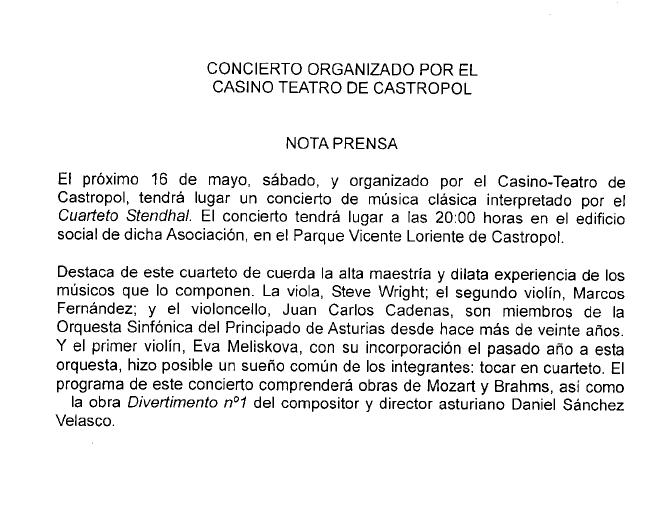 El Casino Teatro de Castropol organiza un concierto de música clásica para el día 16 de mayo, sábado, a las 20:00 horas, en el salón-teatro de su sede social, en el Parque Vicente Loriente de Castropol, con el atractivo de interpretar, además de obras de Mozart y Brahms, una composición del asturiano Daniel Sánchez Velasco.