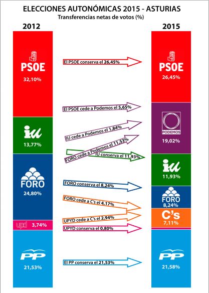 En anteriores convocatorias Foro ganó elecciones y obtuvo votos que arrebató a otras fuerzas políticas, de forma transversal -es decir, ajena a las coordenadas ideológicas derecha e izquierda-, tal y como se comprueba fácilmente analizando las transferencias de voto de las autonómicas del 2011. Entonces, como ahora, los votos viajaron de un sitio para otro, para terminar configurando unos resultados contundentes que no admiten manipulaciones.