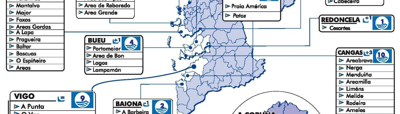 Por provincias, A Coruña consiguió 50, Lugo 22 y Pontevedra 59, contando la playa fluvial de Ponte Caldelas.