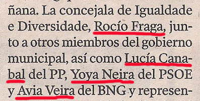 ¿Por qué no se quejan ahora las mujeres de que todos las voces sean femeninas y no haya la de un solo hombre entre ellas? Lo mismo pasó en el Parlamento de la Xunta de Galicia con la aprobación de la ley de no Discriminación y Visibilización del Colectivo LGTB, todo mujeres mientras sus “machos alfa” se desentendían de un causa tan… “femenina”.
