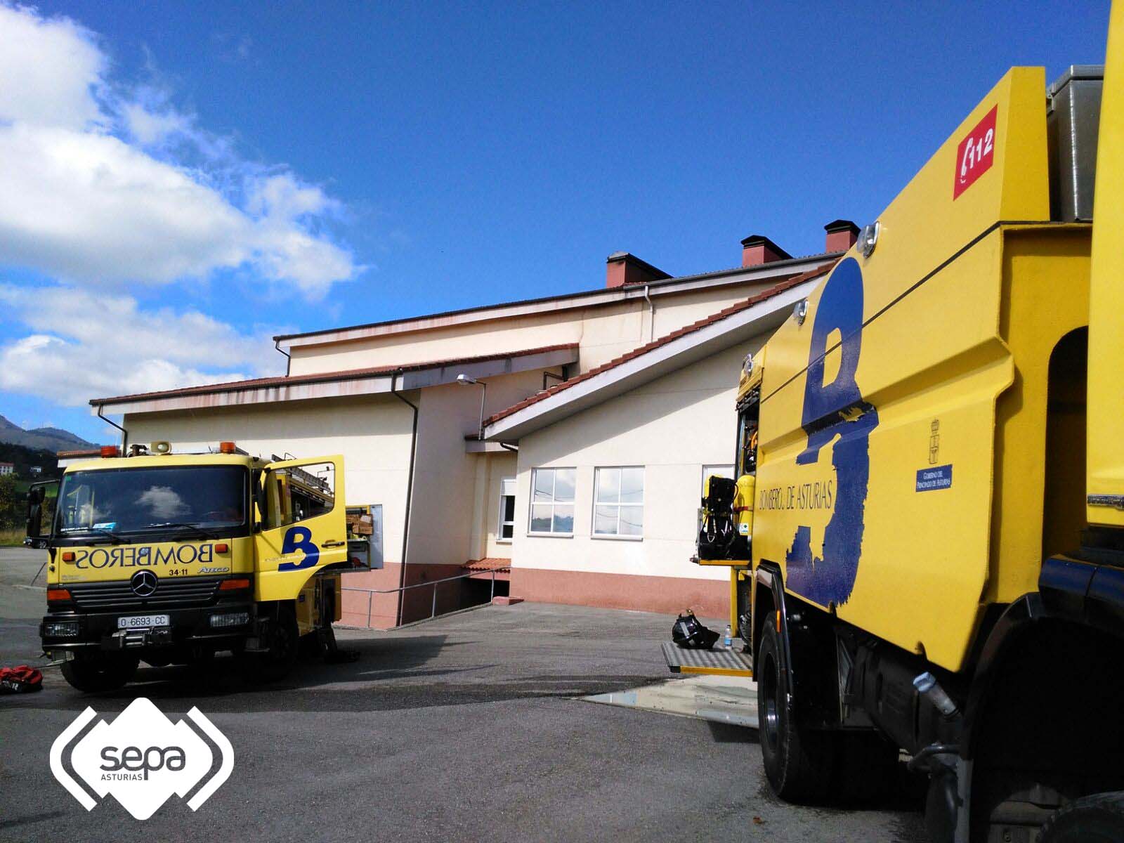 Efectivos de Bomberos del Servicio de Emergencias del Principado de Asturias (SEPA) con base en los parques de Pravia, Grado, Avilés y La Morgal, junto al Jefe de Bomberos de la Zona Centro Este han sofocado un incendio declarado en una fábrica de embutidos en Malleza, Salas.