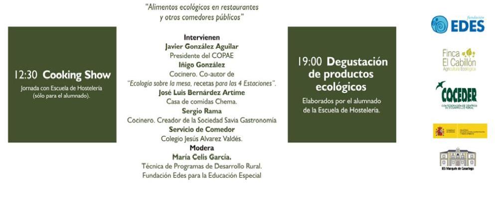 Por la mañana, el conocido cocinero asturiano Sergio Rama hará un Cooking show con los alumnos de la Escuela de Hostelería y de tarde a las 17:00 h, se ha organizado una mesa redonda en el salón de actos del Instituto, en la que intervendrán Sergio Rama, Carlos Nuño Director del COPAE, Iñigo González cocinero y co-autor del libro ¨Ecología sobre la mesa, recetas para las cuatro estaciones”, Jose Luis Bernárdez propietario del restaurante Casa de Comidas Chema con distintivo de establecimiento colaborador del COPAE y María Fernández Rico responsable de cocina del comedor del C.P. Jesús Álvarez Valdés de La Caridad que lleva más de 7 años consumiendo productos ecológicos en el comedor escolar.
