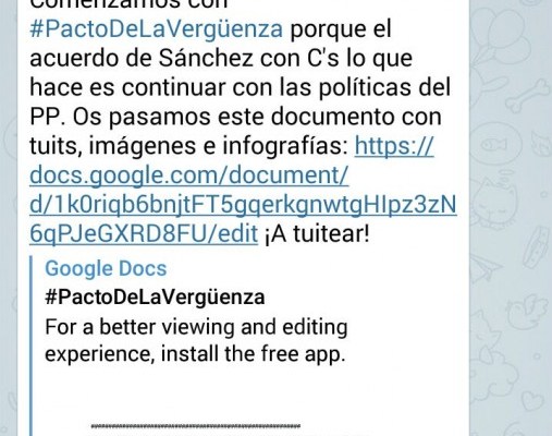 Al margen, existen otros muchos grupos de Telegram, Whatsapp y todo tipo de aplicaciones mediante las cuales se comparte, distribuye y difunde la propaganda podemita.