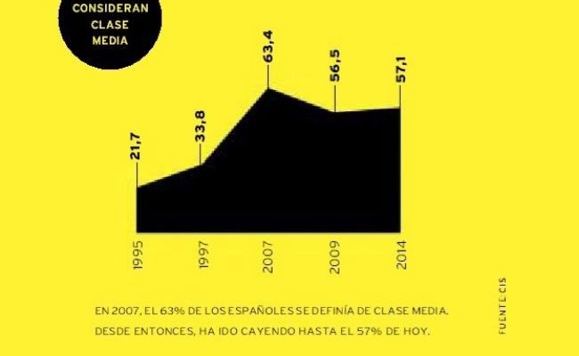 En los primeros 80, con la llegada de la democracia, se alcanzó un empate técnico entre los que se consideraban de clase media (casi el 40% de los españoles) y la clase trabajadora (el 48%). Esa percepción bajó en los años 90 hasta el 20%, y su momento triunfal llegó con el crecimiento económico: en 2007, en pleno boom de la construcción, más del 63% de la población se consideraba a sí misma clase media, según el CIS. Pero a partir de ahí, ese grupo comenzó de nuevo a descender hasta el panorama actual: sólo el 57% de los españoles se engloba en ese segmento, casi el mismo porcentaje que los de clase «trabajadora». ¿Terminará desapareciendo?