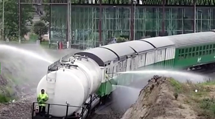 Mais non só as estradas, tamén os camiños de ferro están a ser intensamente fumigados con herbicidas. ADIF, o xestor de infraestruturas ferroviarias estatal, dispón de vaios comboios fumigadores provistos de depósitos, sulfatadoras e mesmo vivendas para o persoal! Un destes comboios vén de ser filmado en Teixeiro (Curtis) esparexendo glifosato en zona urbana e mesmo «fumigando» a un peón que transitaba por baixo dunha vía elevada. Este comboio pode acadar 70 km/h e fumigar ambas as dúas beiras a unha distancia de até 30m.