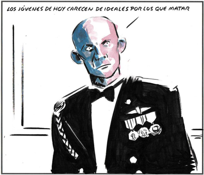 En la viñeta de El Roto del diario el País correspondiente al día 12 de Julio, aparece la caricatura que quiere representar a un militar con uniforme de gala, de mirada entre fanática y robotizada, que parece lamentarse con la siguiente frase: «los jóvenes de hoy carecen de ideales por los que matar».