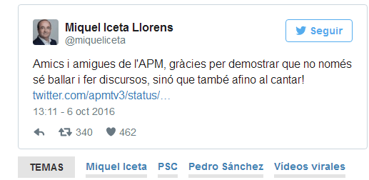Miquel Iceta es el protagonista del último vídeo viral del programa de TV-3 ‘APM’. El espacio satírico ha utilizado el vehemente discurso del primer secretario del PSC en la última Festa de la Rosa y lo ha convertido en canción, a semejanza de lo que realizó en su día con el ‘caloret’ de Rita Barberá.