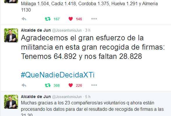 […] primer edil de Jun informa en su cuenta Twitter de que han recogido 64.892 firmas de militantes, entre ellos 192 alcaldes, y de que les faltan 28.828. Y es que según […]