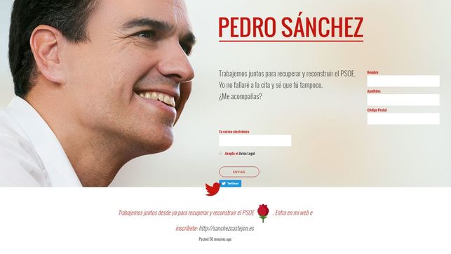 La web sanchezcastejon.es se ha rediseñado para anunciar esta campaña de inscripciones, con la que aboga por «trabajar juntos», en la que él mismo asegura que no fallará a la cita y en la que pregunta a los usuarios y visitantes si le acompañan en la tarea. «Yo no fallaré a la cita y sé que tú tampoco», escribe.