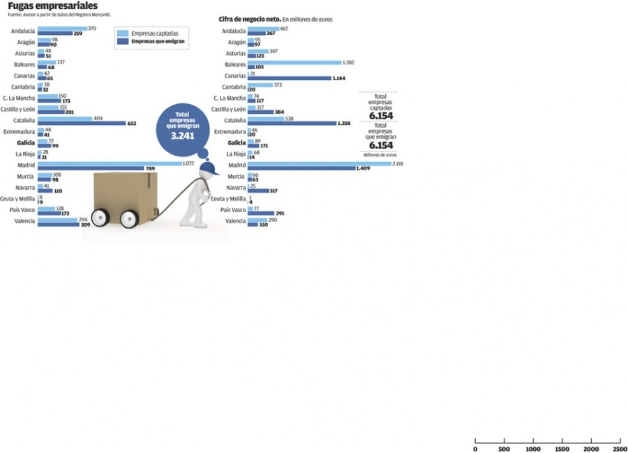 De acuerdo con los citados datos del Registro Mercantil, Galicia recibió este año el asentamiento de 72 empresas, pero, al mismo, tiempo otras 99 decidieron situar su domicilio social en otra comunidad. Se trata del quinto peor saldo, de acuerdo con estas cifras. Ocho comunidades cuentan con un resultado positivo. En toda España, el trasvase afectó a un total de 3.241 empresas que mueven 6.154 millones de euros.