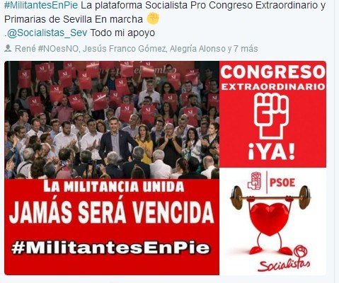 Se forma con numerosos militantes de base una plataforma sevillista para reclamar que se celebren el congreso extraordinario y las primarias que establecen los Estatutos socialistas. La nueva plataforma ya tiene cuenta en Twitter: @Socialistas_Sev, y también correo electrónico: plataformapsoesevilla@gmail.com.