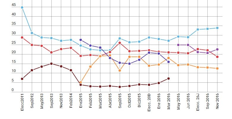 Un detalle llamativo, muestra de esa crisis de credibilidad, es que los votantes del PSOE perciben a Podemos como un partido que defiende mejor que el suyo los intereses de los ciudadanos. Ven al PSOE más cerca de las élites. Pero, a pesar de eso, la gran cantidad de votos que pierde el PSOE no iría a parar a Podemos. Los socialistas se resisten a cambiar a favor del partido de Pablo Iglesias. Si las elecciones se celebrasen ahora el PSOE perdería, según el ObSERvatorio, a la mitad de los votantes que le respaldaron en junio. Pero de ese 50% de votos perdidos solo el 14% iría a Podemos, el resto estaría repartido entre el voto nulo, el voto en blanco, la abstención y la indecisión. El partido que más fidelidad de voto tiene es Podemos (con un 88%), seguido del PP.
