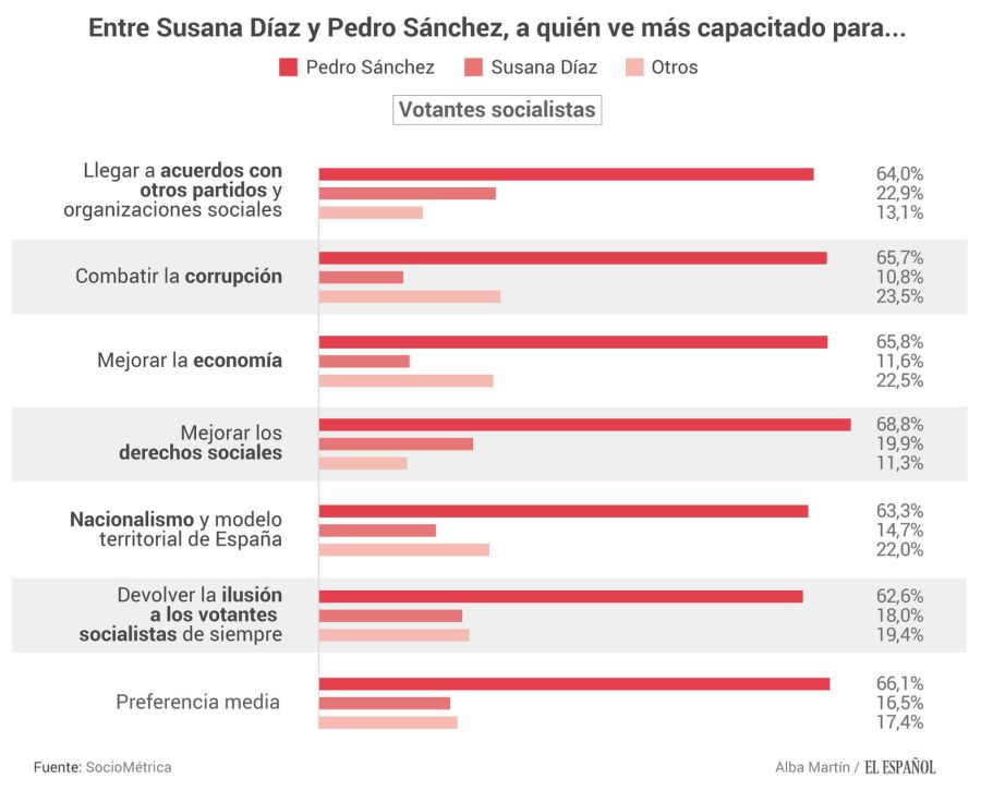 Sánchez también es el preferido para afrontar el reto del nacionalismo y el modelo territorial de España (un 63% lo prefiere frente a un 14,7% que opta por Díaz) e incluso para devolver la ilusión a los votantes socialistas de siempre, donde saca 40 puntos a la presidenta andaluza pese a que muchos dirigentes ven sus dos años al frente del partido como una de las épocas más convulsas y frustrantes en décadas.