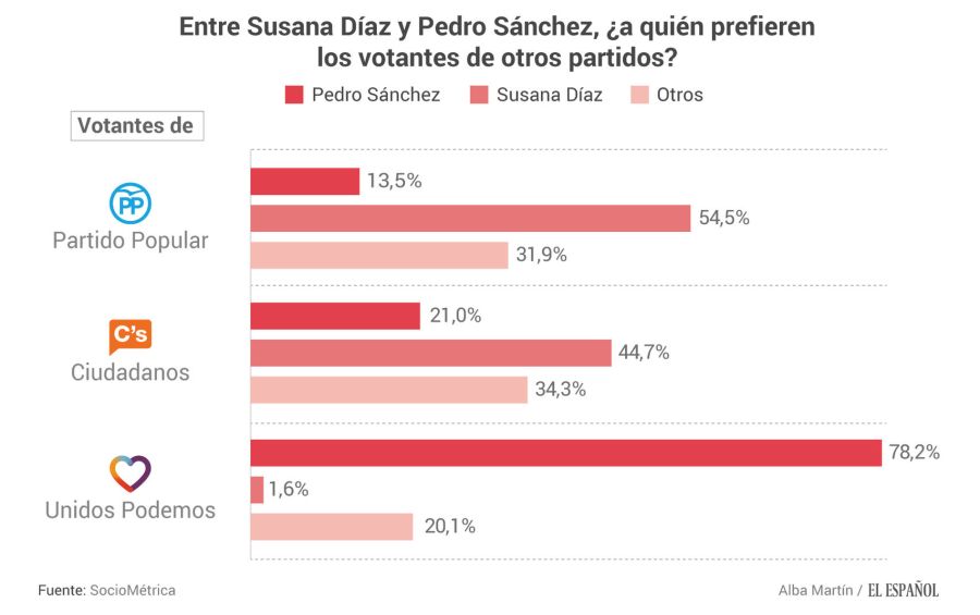 Por partidos, los votantes populares muestran una clara preferencia por la líder de los andaluces socialistas (54,5%) antes que por el ex secretario general (13,5%). Una tendencia que también se repite entre los que apoyan en las urnas al partido de Albert Rivera, cuyo apoyo a Díaz es el doble que a Sánchez.