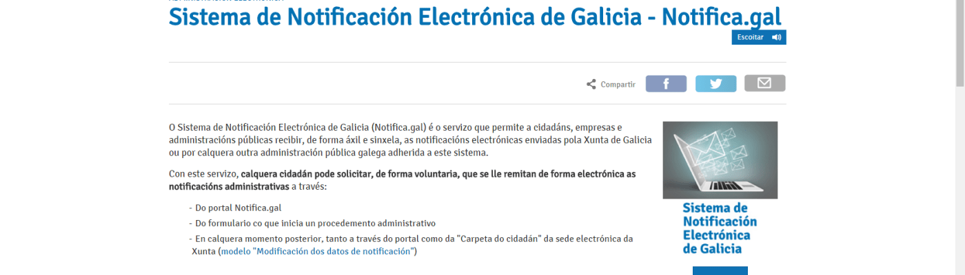 La Xunta de Galicia ponen a la disposición de los ciudadanos el sistema de notificaciones electrónicas Notific@, que permite el envío de notificaciones fidedignas con acuse de recibo y sello electrónico de la Xunta, que confirma tanto el acceso como el rechazo de la notificación. La implantación de este servicio es uno de los requerimientos de la ley 30/2015, que entró en vigor el pasado 2 de octubre y que establece la obligatoriedad de relacionarse de manera electrónica con la Administración para determinados colectivos (personas jurídicas, entidades sin personalidad jurídica, profesionales con colegiación obligatoria y empleados públicos).
