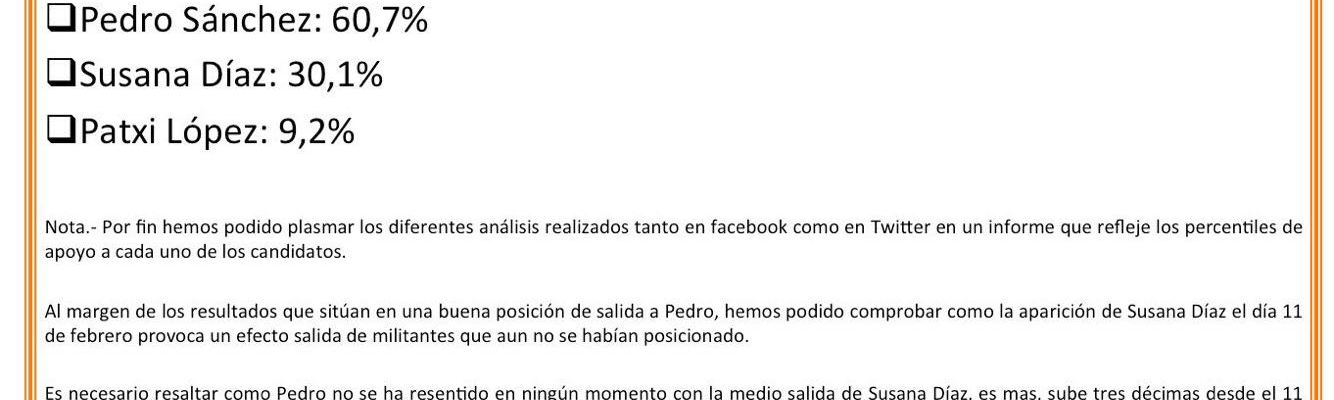 Facebook y twitter se han pronunciado. Pedro Sánchez tendría un apoyo del 60,7% entre los militantes socialistas que están en las redes sociales. Susana Díaz obtendría el 30,1% y Patxi López, el 9,2%. El sondeo, encargado por el equipo de la candidatura de Sánchez a una consultora nacional con la que trabajaban cuando estaban en Ferraz, viene a sumarse a la euforia provocada en los últimos días por el éxito en las convocatorias del ex secretario general, un muerto que el acto de Madrid ha confirmado que goza de buena salud. Por ahora.