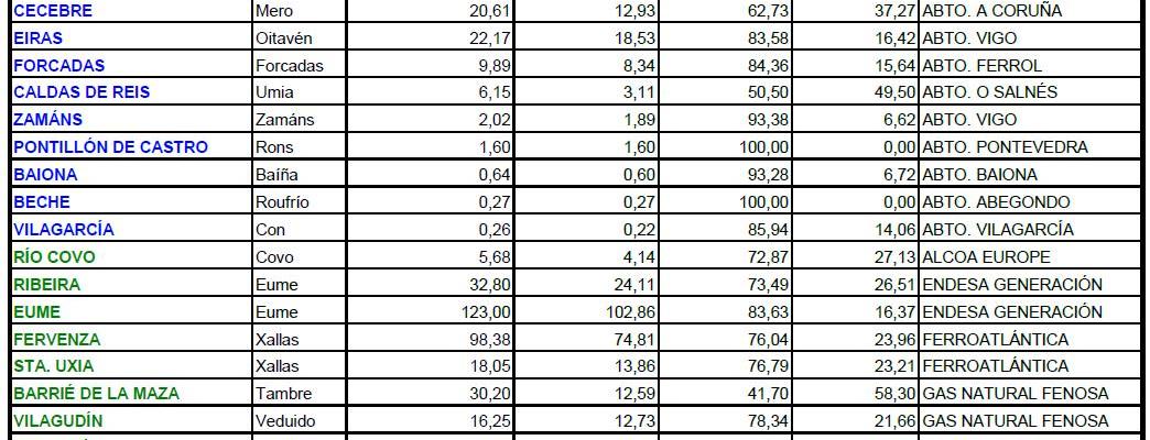 En lo que se refiere a las cuencas destinadas al consumo hidroeléctrico, el embalse de Vilasenín es el que tiene mayor volumen de ocupación. En la tabla, se señalan los datos del estado actual de los embalses de abastecimiento (azul) y de uso hidroeléctrico (verde).