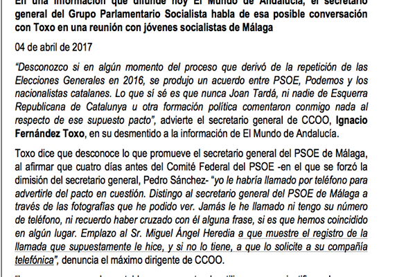 Toxo dice desconocer por qué Heredia dijo que él «le habría llamado por teléfono para advertirle del pacto en cuestión», pero insiste en que «jamás» le ha llamado, ni tiene su número de teléfono. «Distingo al secretario general del PSOE de Málaga a través de las fotografías que he podido ver», asegura. Además, recalca que CC.OO. tiene «por costumbre no intervenir de ninguna de las maneras en los debates de los partidos políticos», de la misma forma que exige que estos no interfieran en el ámbito sindical y, por todo esto, desmiente «por insidiosas, torticeras y mentirosas» las declaraciones de Heredia, uno de los más cercanos seguidores de Susana Díaz.