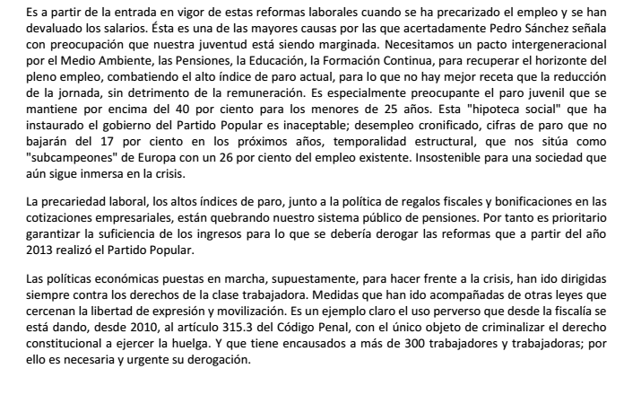 A todas esas medidas del Gobierno del PP se suma, especialmente, la reforma laboral, “que es prioritario derogar para restablecer el equilibrio en las relaciones laborales: restableciendo la preponderancia del convenio colectivo sectorial sobre el de empresa; siendo uno de los efectos más perniciosos el fomento de las empresas multiservicios, pensadas para burlar la negociación colectiva, restituyendo el principio de ultractividad, y echando atrás las facilidades que da a las empresas en el despido, tanto individual como colectivo, que estas reformas introdujeron, entre otros muchos conceptos”.